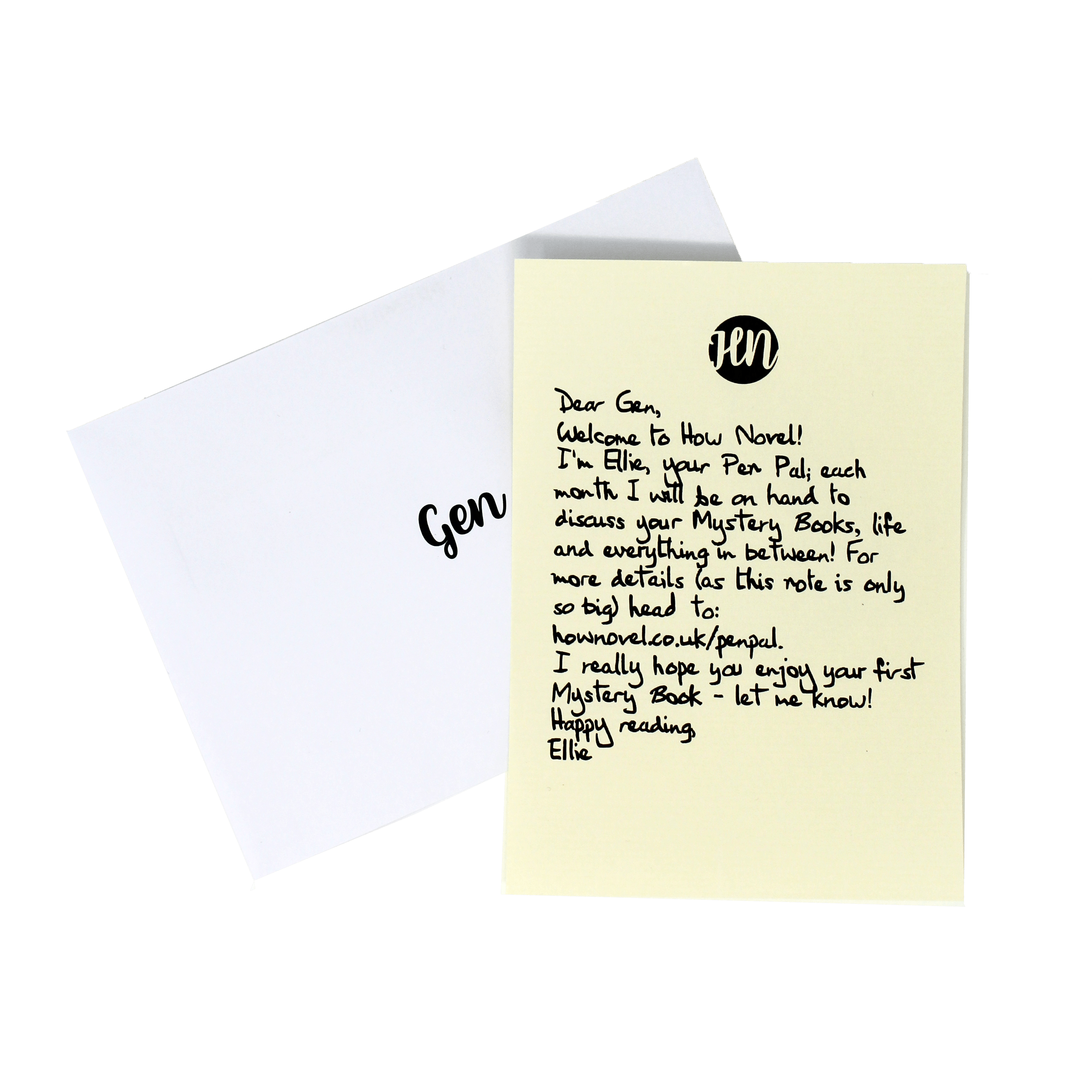All subscribers are assigned their own personal Pen Pal to whom they can write to each month, using the enclosed notecard, to discuss their Mystery Books, life and everything in between! Your Pen Pal, one of the How Novel team, will then include a bespoke, handwritten response in your next box.